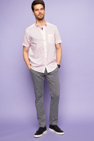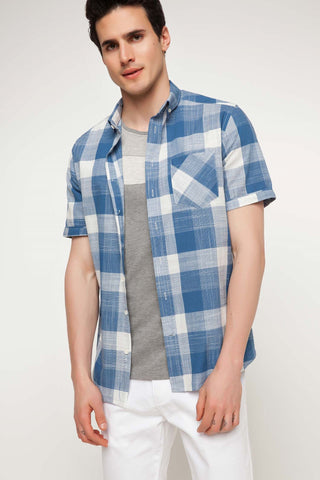 مقاسات العارض: الطول: 1,86 الصدر: 98 الوسط: 76 الخصر: 95 مقاس العينة: M قميص رجالي قطن 100% كم قصير ياقة بولو قصة عادية طول قياسي قميص أزرق بجيب
