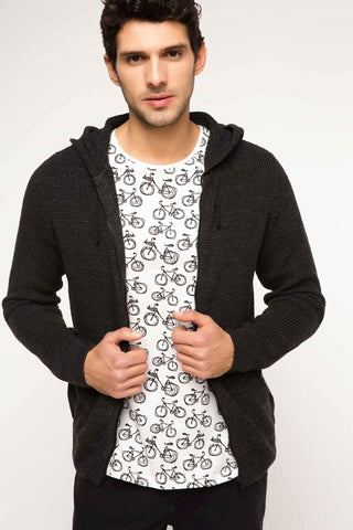 مقاسات العارض: الطول: 1,89 الصدر: 98 الوسط: 80 الخصر: 96 مقاس العينة: M كارديجان رجالي أكريليك 100% قصة ضيقة جاكيت صوف تريكو رمادي بقبعة