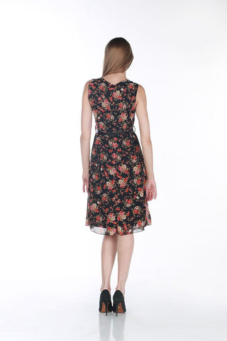 نسيج بوليستر ناعم و مريح مبطن بقماش ناعم ياقة دائرية بدون اكمام سحاب جانبي و حزام قابل للتعديل على الخصر طباعة ديجيتال ازهار على كافة التصميم تصميم بطول الركبة بتنورة...