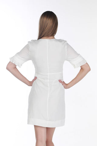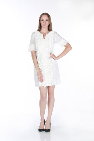 نسيج بوليستر خفيف و بارد مبطن بقماش ناعم ياقة دائرية بفتحة مثلث تصميم مزين بكشكش من الامام اكمام قصيرة بحواف كشكش سحاب جانبي للاغلاق جيوب صغيرة على الجوانب صناعة تركية...