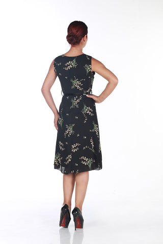 نسيج بوليستر ناعم و مريح مبطن بقماش ناعم ياقة دائرية بدون اكمام سحاب جانبي و حزام قابل للتعديل على الخصر طباعة ديجيتال ازهار على كافة التصميم تصميم بطول الركبة بتنورة...